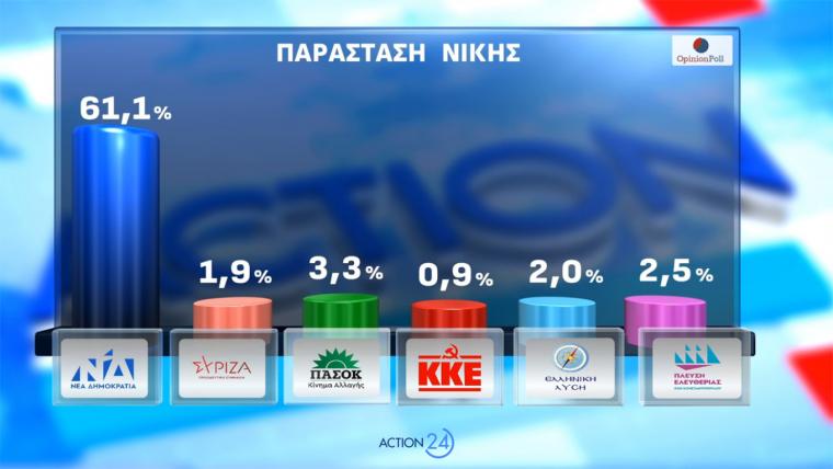 Αυτό έχει ως αποτέλεσμα την δημοσκοπική εκτίναξη της ΝΔ: Το κυβερνών κόμμα κερδίζει 2,5 μονάδες σε σχέση με τον Ιανουάριο και το 31,4% (από 29%) επιλέγει τον Κυριάκο Μητσοτάκη για την πρωθυπουργία. Ενδιαφέρον έχει δε το εύρημα ότι το 56,6% βλέπει ως πολύ ή αρκετά πιθανή τρίτη θητεία για τον πρωθυπουργό, ενώ και η παράσταση νίκης είναι στο 61,1% για τη Νέα Δημοκρατία, με το ΠΑΣΟΚ στο... 3,3%.