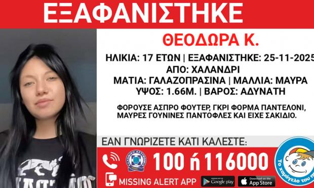 Η Θεοδώρα Κ. εξαφανίστηκε στις 25 Νοεμβρίου και το «Χαμόγελο του Παιδιού» προχώρησε στη δημοσιοποίηση των στοιχείων της ανήλικης κατόπιν αιτήματος της οικογένειας, καθώς ενδέχεται να συντρέχουν λόγοι που θέτουν την ζωή της σε κίνδυνο.