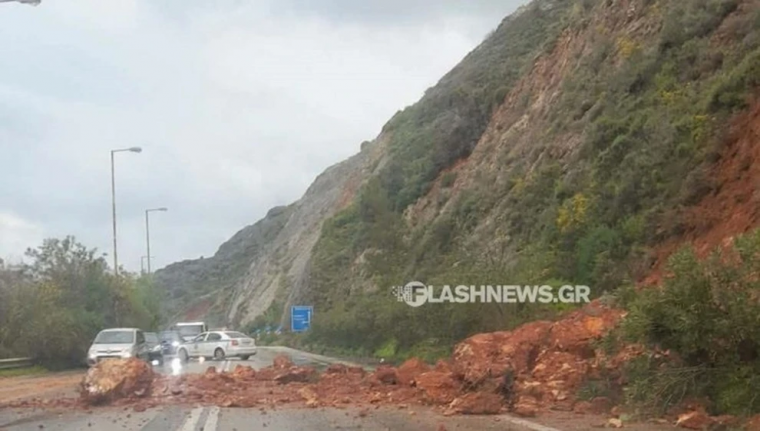 Από την έντονη βροχόπτωση, βράχοι αποκολλήθηκαν και κατέληξαν στο οδόστρωμα, δυσχεραίνοντας την κυκλοφορία των οχημάτων.