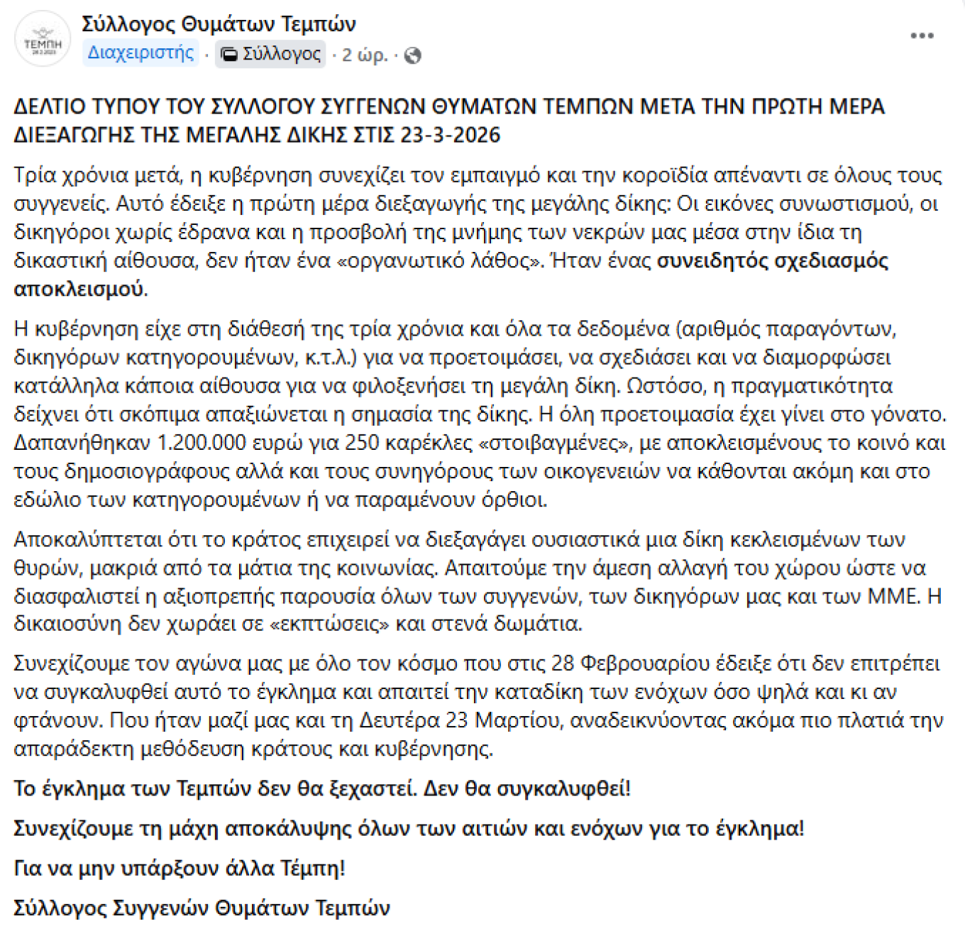 Συνεχίζουμε τον αγώνα μας με όλο τον κόσμο που στις 28 Φεβρουαρίου έδειξε ότι δεν επιτρέπει να συγκαλυφθεί αυτό το έγκλημα και απαιτεί την καταδίκη των ενόχων όσο ψηλά και κι αν φτάνουν. Που ήταν μαζί μας και τη Δευτέρα 23 Μαρτίου, αναδεικνύοντας ακόμα πιο πλατιά την απαράδεκτη μεθόδευση κράτους και κυβέρνησης.