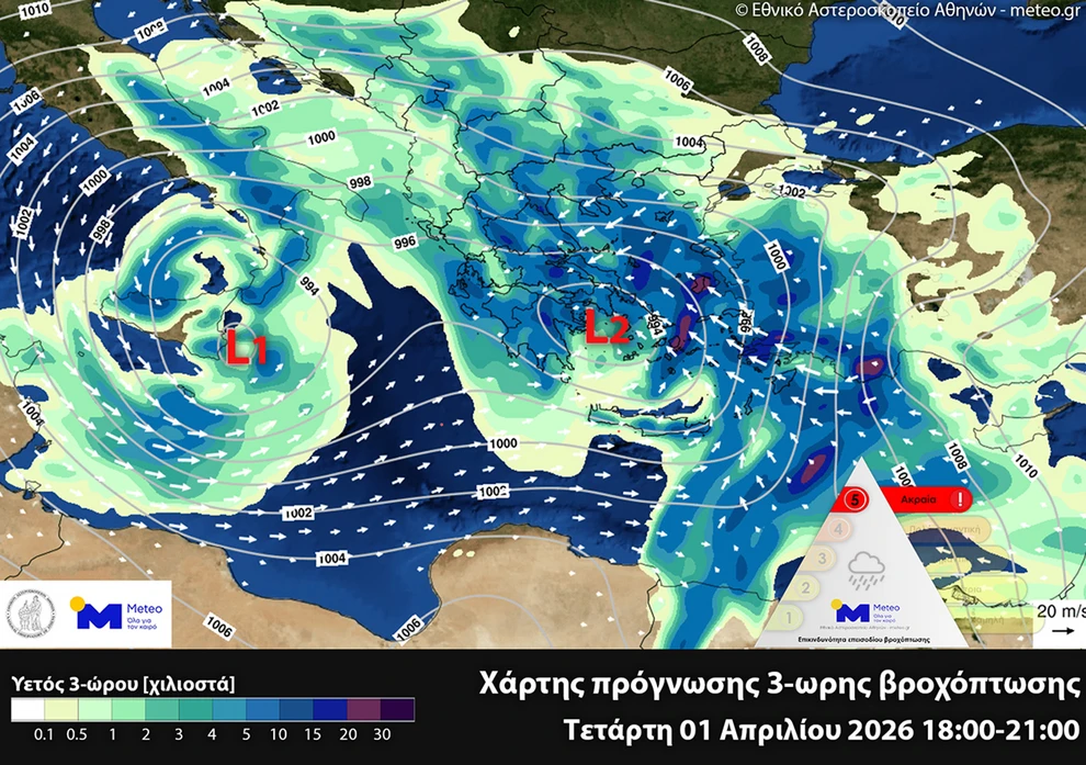 Μετά την προειδοποίηση της ΕΜΥ, τα τελευταία προγνωστικά δεδομένα του Εθνικού Αστεροσκοπείου Αθηνών / meteo.gr κάνουν λόγο για περαιτέρω επιδείνωση του καιρού, η οποία αναμένεται την Τετάρτη 01 Απριλίου 2026, με βροχές, καταιγίδες και θυελλώδεις ανέμους στην επικράτεια της χώρας.