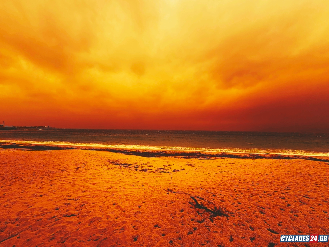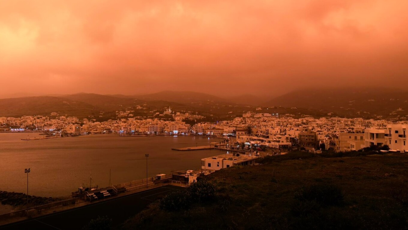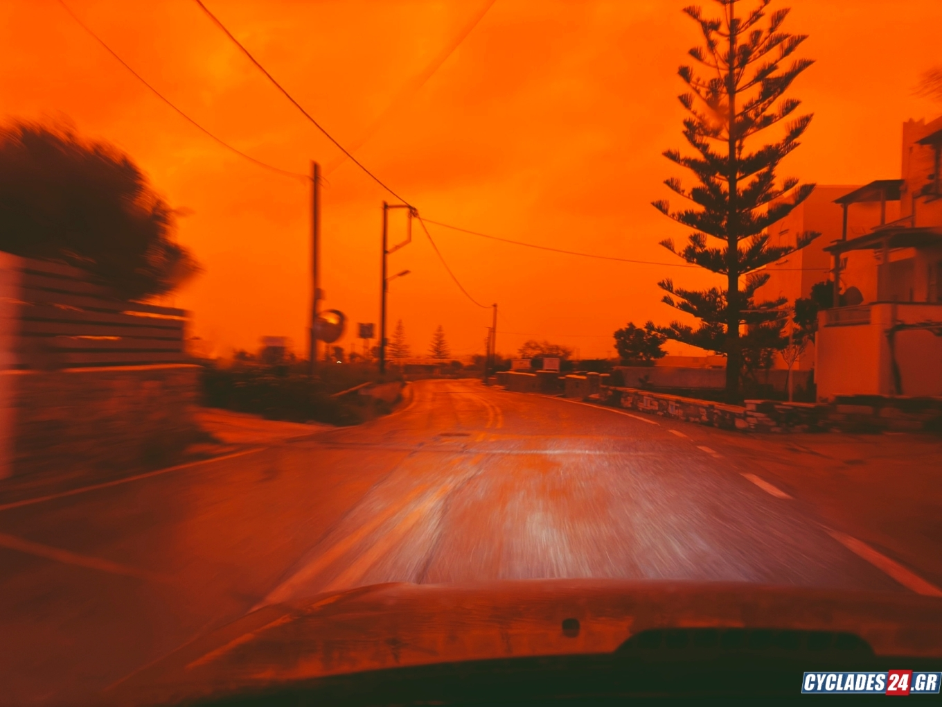 Το σκηνικό επιδεινώθηκε δραματικά από την πρωτοφανή μεταφορά αφρικανικής σκόνης, η οποία κυριολεκτικά «έπνιξε» τη νότια νησιωτική χώρα. Στην Κρήτη και τις Κυκλάδες (Σαντορίνη, Νάξος, Σύρος), ο ουρανός πήρε ένα απόκοσμο, κατακόκκινο χρώμα, μειώνοντας την ορατότητα σε λιγότερο από 100 μέτρα. Στο αεροδρόμιο του Ηρακλείου προκλήθηκε χάος, με πτήσεις να ακυρώνονται ή να εκτρέπονται προς άλλα αεροδρόμια.