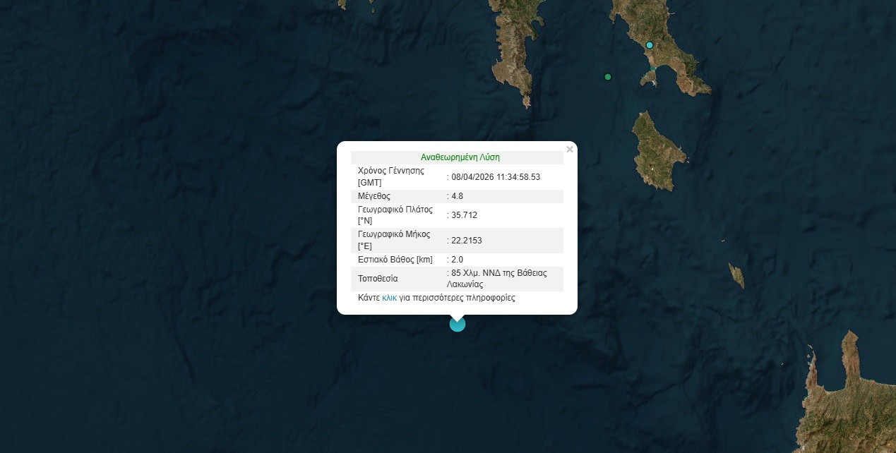 Σύμφωνα με το Γεωδυναμικό Ινστιτούτο του Εθνικού Αστεροσκοπείου Αθηνών, η σεισμική δόνηση είχε επίκεντρο 85 χλμ. νότια-νοτιοδυτικά της Βάθειας Λακωνίας, με το εστιακό βάθος να υπολογίζεται στα 2 χλμ.