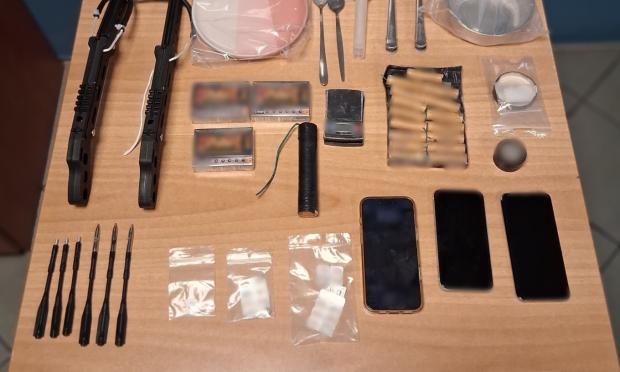 Παράλληλα, εντοπίστηκαν επικίνδυνα αντικείμενα, όπως αυτοσχέδιος δυναμίτης, κροτίδες, λειτουργικές βαλλίστρες με βέλη, καθώς και παιδικά αθύρματα.