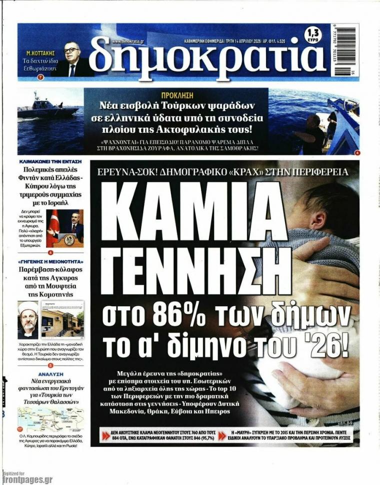 Στο φως της δημοσιότητας φέρνει η εφημερίδα «Δημοκρατία», μέσω του σημερινού της πρωτοσέλιδου, μια εκτενή έρευνα που αποτυπώνει με μελανά χρώματα τη δημογραφική κατάρρευση στην ελληνική επαρχία. Σύμφωνα με τα επίσημα δεδομένα του Υπουργείου Εσωτερικών, η κατάσταση κρίνεται οριακή, καθώς αποκαλύπτεται ότι το 86% των δήμων της χώρας δεν κατέγραψε ούτε μία γέννηση κατά το πρώτο δίμηνο του 2026. Το εύρημα αυτό αναδεικνύει το μέγεθος του προβλήματος που αντιμετωπίζουν οι τοπικές κοινωνίες, οι οποίες φαίνεται να συρρικνώνονται με ανησυχητικούς ρυθμούς.