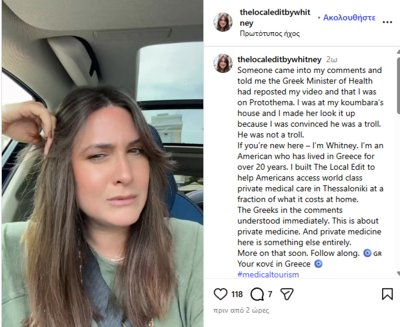 Αρχικά δεν το πίστεψε και νόμιζε ότι ήταν κάποια... τρολιά όπως είπε. «Κάποιος μπήκε στα σχόλιά μου και μου είπε ότι ο Έλληνας Υπουργός Υγείας είχε μοιραστεί το βίντεό μου και ότι εμφανιζόμουν στο Protothema. Ήμουν στο σπίτι της κουμπάρας μου και της ζήτησα να το ψάξει, γιατί ήμουν πεπεισμένη ότι ήταν κάποιος τρολ. Δεν ήταν τρολ» είπε η Αμερικανίδα και συστήθηκε: «Αν είστε καινούργιοι εδώ – είμαι η Whitney. Είμαι Αμερικανίδα και ζω στην Ελλάδα πάνω από 20 χρόνια. Δημιούργησα το The Local Edit για να βοηθήσω τους Αμερικανούς να έχουν πρόσβαση σε ιδιωτική ιατρική περίθαλψη παγκόσμιας κλάσης στη Θεσσαλονίκη, με κόστος πολύ χαμηλότερο από αυτό που θα πλήρωναν στην πατρίδα τους. Οι Έλληνες στα σχόλια κατάλαβαν αμέσως. Πρόκειται για την ιδιωτική ιατρική. Και η ιδιωτική ιατρική εδώ είναι κάτι εντελώς διαφορετικό».