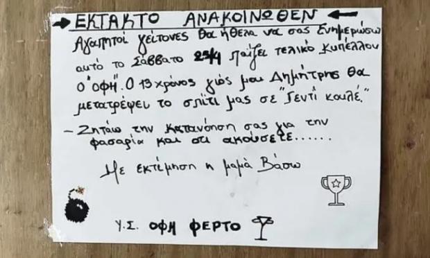 Μία μητέρα ενός νεαρού οπαδού των Κρητικών θέλησε να προετοιμάσει και να ζητήσει κατανόηση από τους γείτονες για τη φασαρία που θα γίνει κατά τη διάρκεια του μεγάλου αγώνα σήμερα το βράδυ, καθώς όπως έγραψε στο σημείωμα, «ο 13χρονος γιος μας θα μετατρέψει το σπίτι μας σε Γεντί Κουλέ».