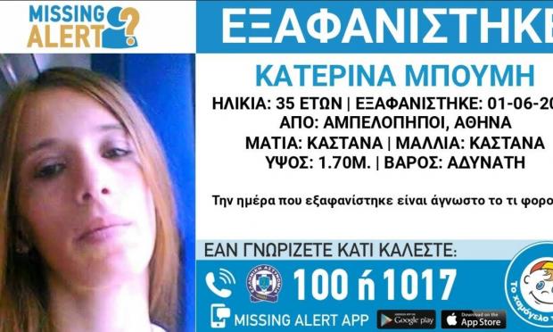 Κοινωνία 27.01.2026 - 23:19 0 Συναγερμός στους Αμπελόκηπους για την εξαφάνιση 35χρονηςΗ Κατερίνα Μπούμη έχει ύψος 1,70μ., είναι αδύνατη, έχει καστανά μάτια και καστανά μαλλιά
