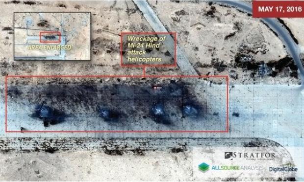 To BBC δημοσίευσε δορυφορικές φωτογραφίες τις οποίες απέκτησε από το γνωστό για τη σχέση του με τη CIA, Stratfor, και δείχνουν την καταστροφή τεσσάρων ρωσικών επιθετικών ελικοπτέρων Mi-24 και είκοσι φορτηγών στην στρατηγικής σημασίας αεροπορική βάση Tiyas (T4) στην κεντρική Συρία.