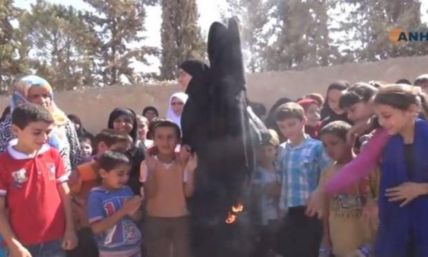 Σε βίντεο που δημοσίευσε το κουρδικό πρακτορείο ειδήσεων ANHA, βλέπουμε το πλήθος να ζητωκραυγάζει καθώς μια γυναίκα βάζει φωτιά και καίει μια μπούρκα.