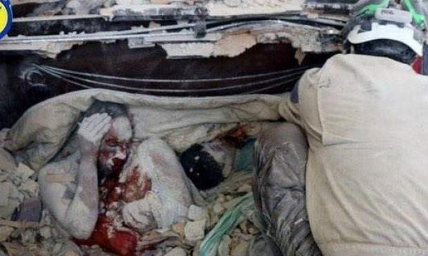 Σε αυτές, μία γυναίκα αγκαλιά με το νεογέννητο μωρό της βρίσκεται νεκρή κάτω από τα ερείπια του σπιτιού της έπειτα από τον βομβαρδισμό που έλαβε χώρα σήμερα. Δίπλα της το μεγαλύτερό της παιδί είναι κείτεται και αυτό νεκρό.