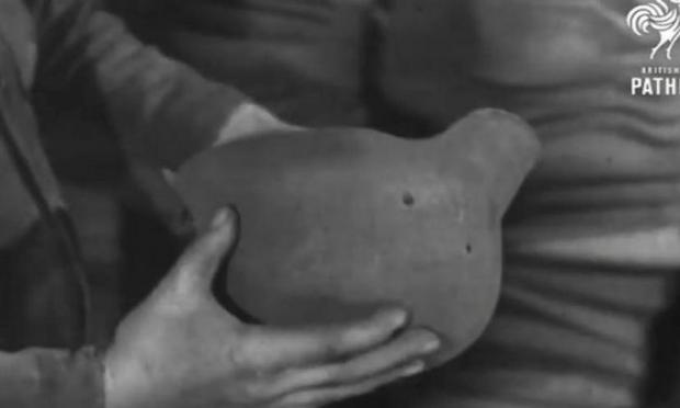 Πλάνα από ένα εργοστάσιο στη Γερμανία το 1946, δείχνουν τη βιομηχανική διαδικασία που μετατρέπει τα γερμανικά στρατιωτικά κράνη σε σουρωτήρια και άλλα μαγειρικά σκεύη.