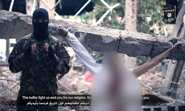 Ένας τζιχαντιστής με κουκούλα να καλύπτει το πρόσωπό του, δίνει οδηγίες και δείχνει κυριολεκτικά την πρακτική, «εκτελώντας» έναν άνθρωπο.