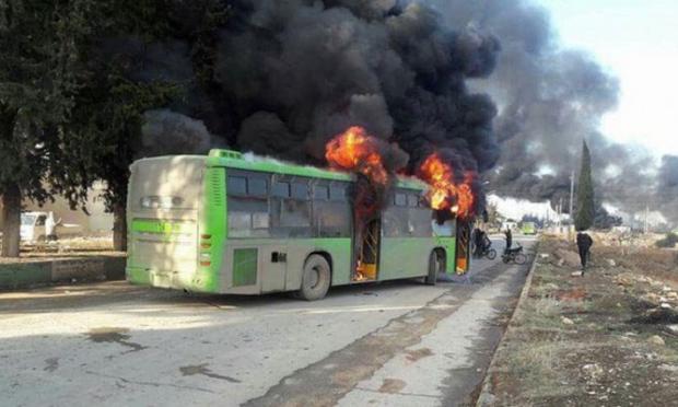 Η νέα συμφωνία για εκκένωση του Χαλεπίου, είναι στον αέρα, καθώς λεωφορεία που είχαν σταλεί για να παραλάβουν κατοίκους δύο φιλοκυβερνητικών χωριών δέχτηκαν επίθεση και πυρπολήθηκαν.