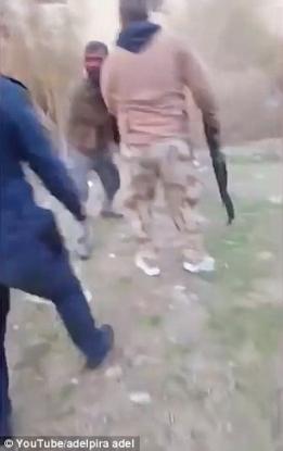 Eνα άλλο θύμα δέχεται την επίθεση με κλωτσιές από στρατιώτες την ώρα που ακούγονται πυροβολισμοί στο παρασκήνιο.