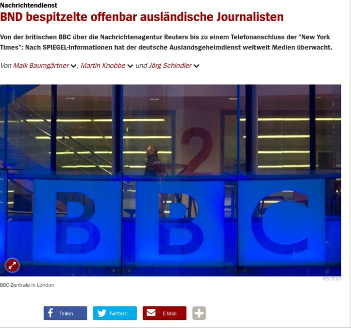 Οπως αποκαλύπτει το Spiegel, από το 1999 και για τουλάχιστον τρία χρόνια, η Ομοσπονδιακή Υπηρεσία Πληροφοριών της Γερμανίας,BND, παρακολουθούσε πάνω από 50 τηλέφωνα, αριθμούς φαξ και διευθύνσεις ηλεκτρονικού ταχυδρομείου δημοσιογράφων του BBC, του Reuters και των New York Times