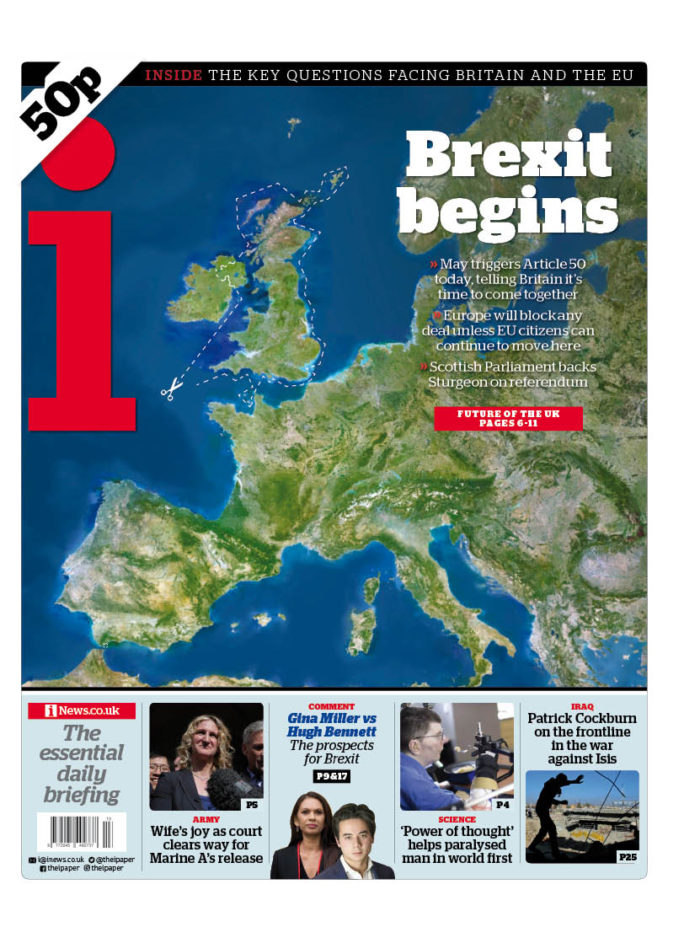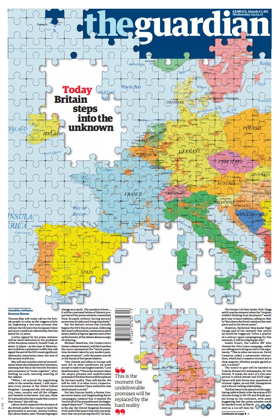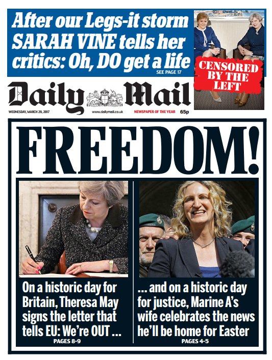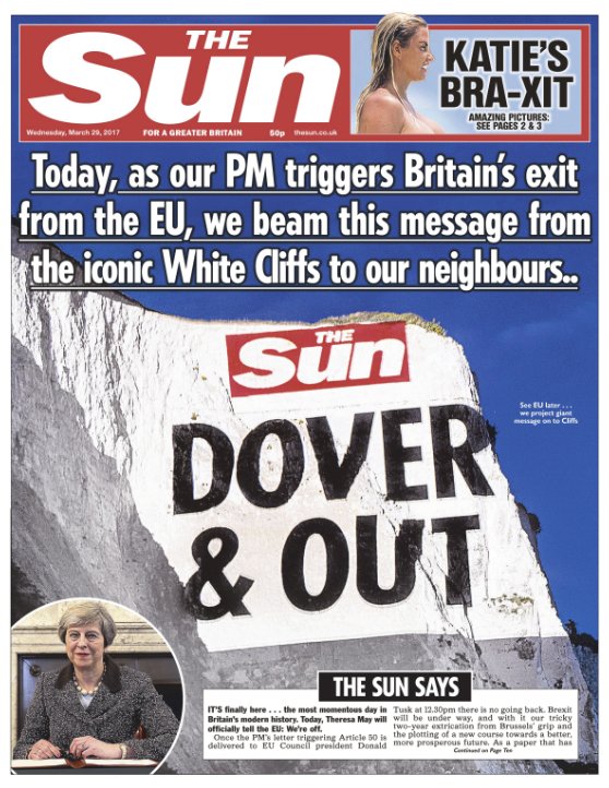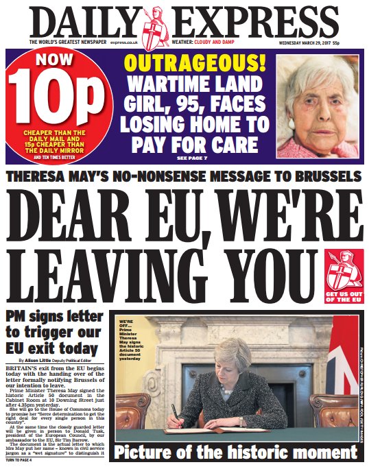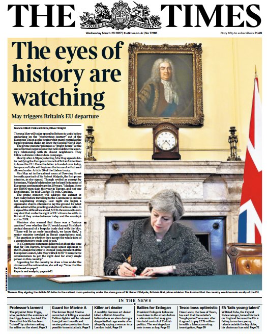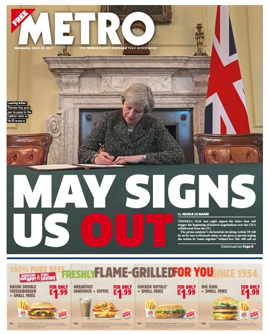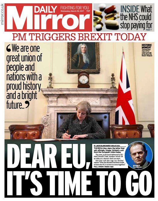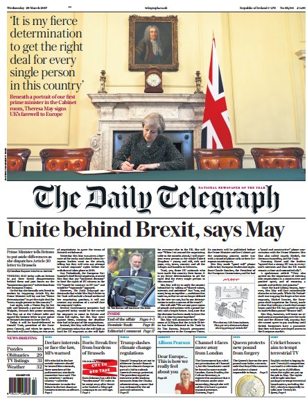Οι βρετανικές εφημερίδες αποτυπώνουν την ιστορική στιγμή για την Μεγάλη Βρετανία, καθώς η πρωθυπουργός Τερέζα Μέι υπόγραψε την επίσημη επιστολή που θα παραδοθεί σε λίγες ώρες στον πρόεδρο του Ευρωπαϊκού Συμβουλίου Ντόναλντ Τουσκ, ώστε να ξεκινήσουν έτσι οι μακρόχρονες διαδικασίες για να ολοκληρωθεί η απόφαση.