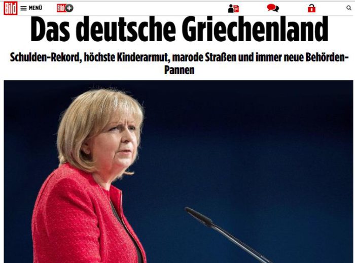 Υπό τον τίτλο: «Η Ελλάδα της Γερμανίας» και υπότιτλο: «Ρεκόρ χρέους, το υψηλότερο ποσοστό παιδικής φτώχειας...», η γερμανική εφημερίδα συγκρίνει το πολυπληθέστερο γερμανικό κρατίδιο με την Ελλάδα.