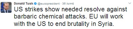 «Τα αμερικανικά πυραυλικά πλήγματα στη Συρία δείχνουν την απαιτούμενη αποφασιστικότητα απέναντι στις βαρβαρικές χημικές επιθέσεις», δήλωσε ο πρόεδρος του Ευρωπαϊκού Συμβουλίου Ντόναλντ Τουσκ, λίγες ώρες μετά την αμερικανική στρατιωτική επιχείρηση κατά της αεροπορικής βάσης των δυνάμεων της Δαμασκού στη βόρεια Συρία.