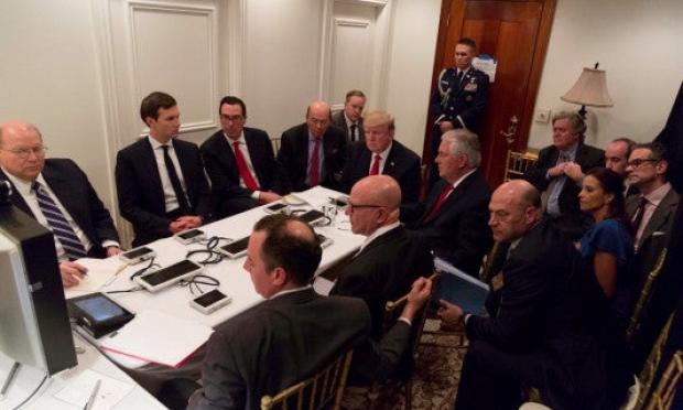 Βλοσυρός με τον στενό του σύμβουλο Στιβ Μπάνον πίσω του, τον γαμπρό του (σύζυγο της Ιβάνκα) Τζάρεντ Κούσνερ στο πλευρό του, όπως επίσης τους υπουργούς Οικονομικών και Εξωτερικών παρόντες, τον προσωπάρχη του Λευκού Οίκου Ράινς Πρίμπους επίσης, ο Τραμπ ενημερώνεται για την επέμβαση στη Συρία.