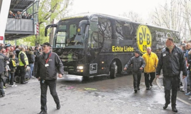 Τρόμος και... μυστήριο από τις τρεις εκρήξεις που σημειώθηκαν κοντά στο πούλμαν της Μπορούσια Ντόρτμουντ, την ώρα που κατευθυνόταν προς το γήπεδο για το ματς με τη Μονακό. Το περιστατικό συνέβη στο δρόμο Wittbräucker (10 χιλιόμετρα από το γήπεδο της Ντόρτμουντ). Σύμφωνα με τη γερμανική αστυνομία, έσκασαν τα λάστιχα του πούλμαν και έσπασαν πολλά παράθυρα, με αποτέλεσμα να τραυματιστεί στο χέρι από τα γυαλιά ο Μαρκ Μπάρτρα, ο οποίος μεταφέρθηκε στο νοσοκομείο.
