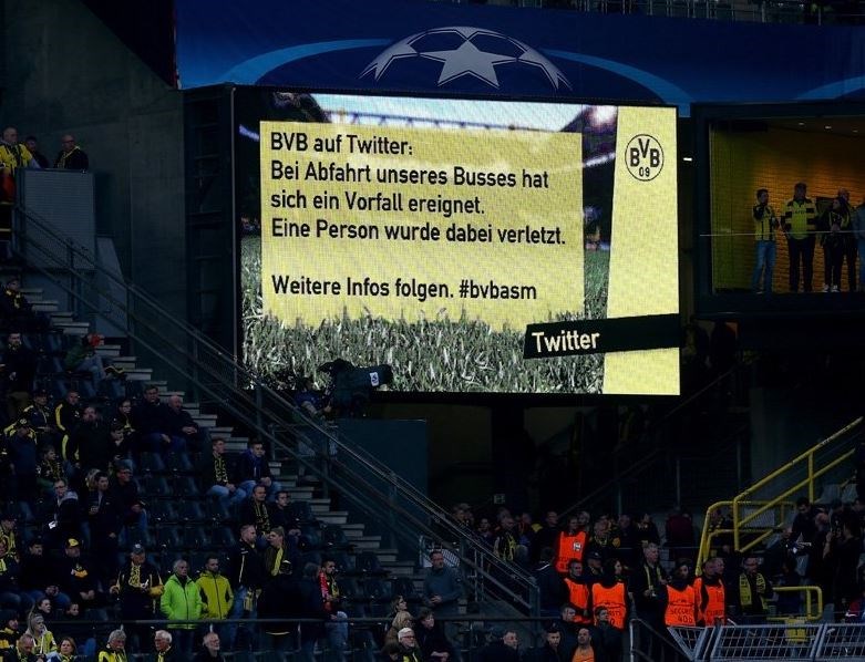 Η Ντόρτμουντ έχει επιβεβαιώσει την έκρηξη και τον τραυματισμό του Μπάρτρα. Η γερμανική ομάδα σημειώνει ότι όλοι είναι ασφαλείς και πως δεν υπάρχει κανένας κίνδυνος στο γήπεδο.
