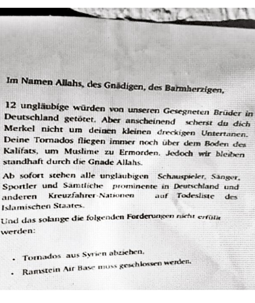 12 άπιστοι σκοτώθηκαν στη Γερμανία απ’ τα ευλογημένα αδέρφια μας. Αλλά προφανώς, Μέρκελ, ούτε που νοιάζεσαι για τους μικρούς, βρώμικους υποτελείς σου. Τα Tornados σου πετούν ακόμη πάνω απ’ τα εδάφη του Χαλιφάτου για να σκοτώνουν Μουσουλμάνους.
