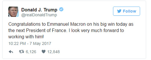 Ο 45ος πρόεδρος των ΗΠΑ, Ντόναλντ Τραμπ έδωσε συγχαρητήρια στον νέο πρόεδρο της Γαλλικής Δημοκρατίας Εμανουέλ Μακρόν.
