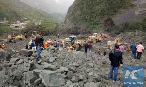 Το εθνικό τηλεοπτικό δίκτυο CCTV μεταδίδει απ' ευθείας εικόνες αστυνομικών και κατοίκων που φορούν αδιάβροχα και στέκονται πάνω σε τεράστιους γκρι βράχους, ενώ δίπλα τους πορτοκαλί εκσκαφείς επιχειρούν να καθαρίσουν τα μπάζα.