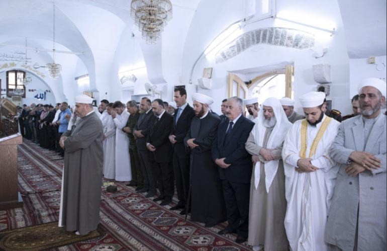 Η κρατική τηλεόραση μετέδωσε εικόνες του Άσαντ να προσεύχεται σ' ένα μεγάλο τέμενος της Χάμα πίσω από τον ιμάμη του, ενώ δίπλα του στέκονταν και άλλοι ιερωμένοι καθώς και ένα μεγάλο πλήθος πιστών.