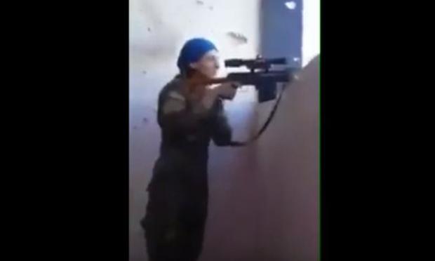 Στο συγκεκριμένο βίντεο, γυρισμένο σε ένα εγκαταλελειμμένο κτήριο, που είναι η βάση μιας ομάδας μαχητριών κατά των τζιχαντιστών του Ισλαμικού Κράτους στη Ράκα, όπου μαίνεται ο πόλεμος, βλέπουμε μια πολύ νεαρή κοπέλα να κρατά όπλο, να σημαδεύει και να πυροβολεί. Κλάσματα του δευτερολέπτου μετά, μια σφαίρα, προφανώς από ελεύθερο σκοπευτή των τζιχαντιστών, περνάει ξυστά από το κεφάλι της και σκάει στον τοίχο πίσω της.