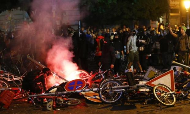 Περίπου 20.000 αστυνομικοί επιστρατεύτηκαν προκειμένου ν' αντιμετωπίσουν αρκετές εκατοντάδες διαδηλωτών κι αντί-καπιταλιστών που πυρπόλησαν αυτοκίνητα, λεηλάτησαν καταστήματα κι έριξαν βόμβες μολότοφ, αλλά κι έσπασαν πεζοδρόμια στην πόλη.