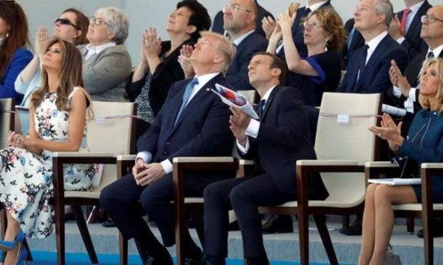 Ο Γάλλος πρόεδρος φάνηκε να απολαμβάνει την ευχάριστη μοντέρνα νότα στις συνηθισμένες παραστάσεις της στρατιωτικής μπάντας. Ο Τραμπ, ωστόσο δεν εντυπωσιάστηκε, μάλλον, τόσο, καθώς παρέμεινε ανέκφραστος καθ' όλη τη διάρκεια.