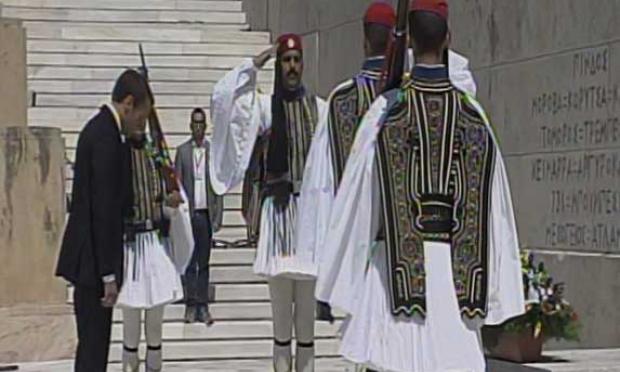 Η προεδρική αυτοκινητοπομπή κατευθύνεται προς το Σύνταγμα όπου ο κ. Μακρόν θα καταθέσει στεφάνι στο Μνημείο του Αγνώστου Στρατιώτη.