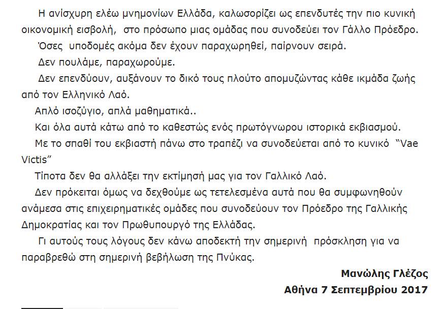 Με ένα πύρινο άρθρο στο προσωπικό του blog ο Μανώλης Γλέζος εξηγεί γιατί δεν αποδέχθηκε την πρόσκληση για την εκδήλωση προς τιμήν του Εμ. Μακρόν στην Πνύκα.