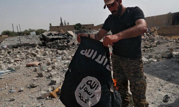 Μαχητής των υποστηριζόμενων από τις ΗΠΑ Συριακών Δημοκρατικών Δυνάμεων βάζει φωτιά σε μια σημαία του ISIS στη Ράκα