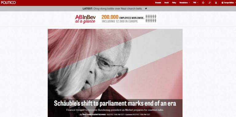 «Το τέλος μίας ολόκληρης εποχής». Αυτός είναι και ο τίτλος του άρθρου που αναφέρεται στην… μετακόμιση Σόιμπλε. Στην ανάλυσή του, το Politico αναφέρει ότι θα περάσουν αρκετές εβδομάδες ίσως και μεγαλύτερο διάστημα μέχρι να γίνει γνωστό ποιος θα είναι ο αντικαταστάτης του Σόιμπλε. Κι αυτό με δεδομένο ότι βρισκόμαστε στο ξεκίνημα της μετεκλογικής περιόδου. Και κατά προέκταση των διαπραγματεύσεων για τον σχηματισμό της νέας γερμανικής κυβέρνησης. Σόιμπλε