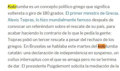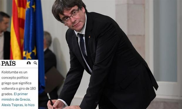 Κάνοντας τις... αναπόφευκτες συγκρίσεις με την «κωλοτούμπα» του Έλληνα πρωθυπουργού, Αλέξη Τσίπρα, ο οποίος ανέτρεψε το αποτέλεσμα του δημοψηφίσματος του Ιουλίου του 2015, η El Pais γράφει: «Κωλοτούμπα είναι ένας πολιτικός όρος, που σημαίνει στροφή 180 μοιρών. Ο πρωθυπουργός της Ελλάδας, ο Αλέξης Τσίπρας, έκανε αυτή τη λέξη διάσημη, αφού οδήγησε τη χώρα σε δημοψήφισμα, με το ερώτημα εάν γίνεται αποδεκτό το σχέδιο συμφωνίας με την ΕΚΤ, την Κομισιόν και το ΔΝΤ. Παρότι η πλειονότητα ψήφισε "όχι", ο ίδιος κατέληξε να κάνει το αντίθετο από αυτό που ζήτησε ο λαός και ζήτησε τρίτο πακέτο βοήθειας. Στις Βρυξέλλες μιλάνε για την καταλανική κωλοτούμπα».