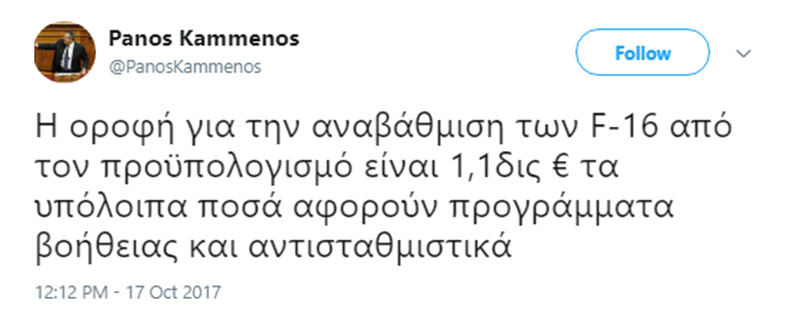Λίγη μόλις ώρα μετά την κοινή συνέντευξη του Προέδρου των ΗΠΑ και του Έλληνα πρωθυπουργού όπου ο Ντόναλντ Τράμπ μίλησε για την αναβάθμιση των F-16 και αποκάλυψε ότι το κόστος της φτάνει τα 2,4 δισ δολάρια, ο Έλληνας υπουργός Άμυνας έσπευσε μέσω twitter να... διαψεύσει τον πλανητάρχη.