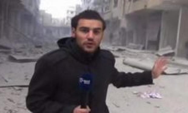 Στο συγκλονιστικό βίντεο, ο δημοσιογράφος Yaman al-Sayed μιλάει on camera με φόντο τα συντρίμμια της νοτιοδυτικής πόλης Irbin, ανατολικά της Δαμασκού, ξαφνικά κάποιος ακούγεται να φωνάζει και ένας δυνατός θόρυβος διακόπτει την μετάδοση.