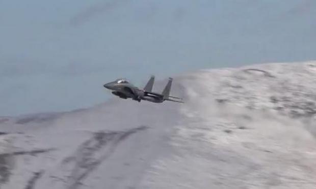 Μαχητικό αεροσκάφος F-15 πραγματοποιεί απίστευτα επικίνδυνους ελιγμούς με φόντο τα χιονισμένα βουνά της Ουαλίας.