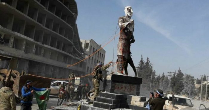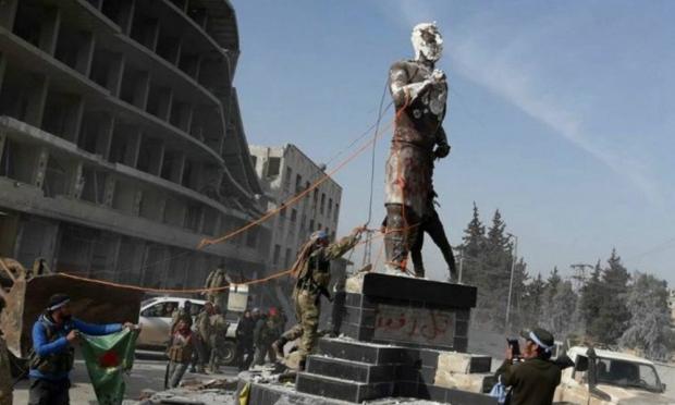Ένα άγαλμα – σύμβολο στο κέντρο της πόλης του Αφρίν κατέβασαν από το βάθρο του και διέλυσαν οι Σύροι αντάρτες που μαζί με τους τούρκους στρατιώτες, πήραν υπό τον έλεγχό τους την πόλη.