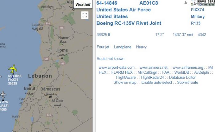 Σύμφωνα με τις πληροφορίες, το αεροσκάφος των ΗΠΑ, το RC-135V, το οποίο φέρει τον αριθμό 64-14846 και χρησιμοποιεί το σήμα κλήσης FIXX74, απογειώθηκε από την αμερικάνικη βάση της Σούδας και πετούσε για πολύ ώρα κοντά στην μεσογειακή ακτή της Συρίας και του Λιβάνου.