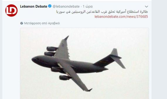 Σύμφωνα με δημοσίευμα, Αμερικανικό αεροσκάφος στρατηγικής αναγνώρισης πραγματοποίησε εισβολή κοντά στην ακτή της Συρίας τη Δευτέρα, όπου βρίσκεται η ρωσική βάση Hameimim και η ρωσική βάση ανεφοδιασμού της Tartus.