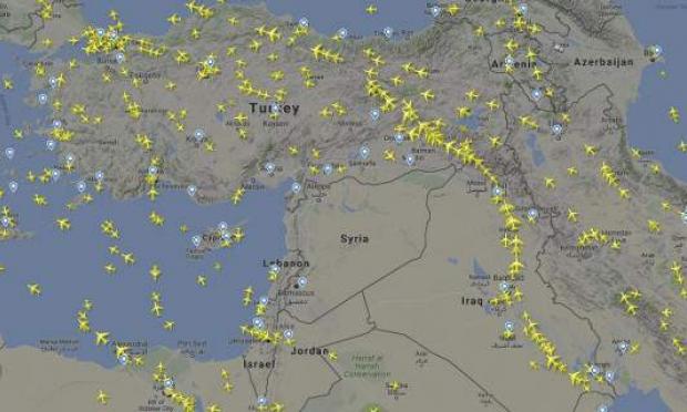 Οπως φαίνεται και στην εικόνα ο εναέριος κυκλοφοριακός φόρτος έχει μεταφερθεί στα σύνορα προς την πλευρά της Τουρκίας και του Ιράκ.