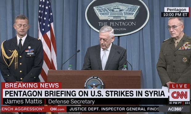 Ο αρχηγός του επιτελείου των αμερικανικών ενόπλων δυνάμεων στρατηγός Τζο Ντάνφορντ δήλωσε πως οι δυτικές δυνάμεις έπληξαν στις 04:00 (ώρα Ελλάδας) τρεις στόχους που συνδέονται με το συριακό πρόγραμμα χημικών όπλων, τον έναν κοντά στη Δαμασκό και τους δύο άλλους στην περιοχή της Χομς, στην κεντρική Συρία.