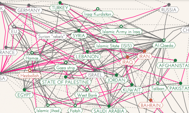 Η πολυπλοκότητα της χαώδους κατάστασης στην Μ.Ανατολή. Αν κάνετε κλικ πάνω στους παίκτες (κυβερνήσεις και οργανώσεις) θα δείτε τις σχέσεις τους στην περιοχή. Οι σχέσεις αυτές είναι συχνά μπερδεμένες και μεταβαλλόμενες, κυρίως λόγω της διαφοροποίησης των συμφερόντων.