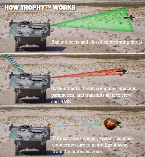 Σημειώνεται ακόμη ότι το σύστημα Trophy δοκιμάστηκε διεξοδικά σε επιλεγμένα τανκς M1A2 στην Ευρώπη και τη Μέση Ανατολή.