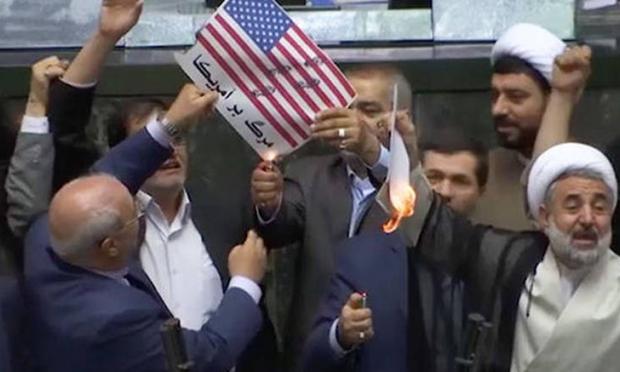 Οι εικόνες που μεταδόθηκαν από πολλά ιρανικά μέσα ενημέρωσης δείχνουν έναν βουλευτή να κραδαίνει μία χάρτινη αμερικανική σημαία και στη συνέχεια να της βάζει φωτιά στην έδρα της αίθουσας του κοινοβουλίου.