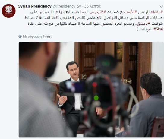Ο πρόεδρος της παγκόσμιας Αντίστασης Μπασάρ αλ Άσαντ επέλεξε να μιλήσει στον ελληνικό τύπο και συγκεκριμένα στο διευθυντή της Καθημερινής Αλέξη Παπαχελά και να σπάσει την σιωπή του μετά το χτύπημα της τρόικας του πολέμου. Ο Άσαντ ο καθ΄ύλην αρμόδιος απαντά αν ο Γ’ Παγκόσμιος θα ξεκινήσει από τη Συρία σύμφωνα με τον Παπαχελά. Η συνέντευξη θα καταχωρηθεί στην Καθημερινή και θα μεταδοθεί από το δελτίο ειδήσεων του ΣΚΑΙ στις 20:00 την Πέμπτη. H σελίδα της συριακής προεδρίας ανακοινώνει την συνέντευξη στο ελληνικό μέσο.